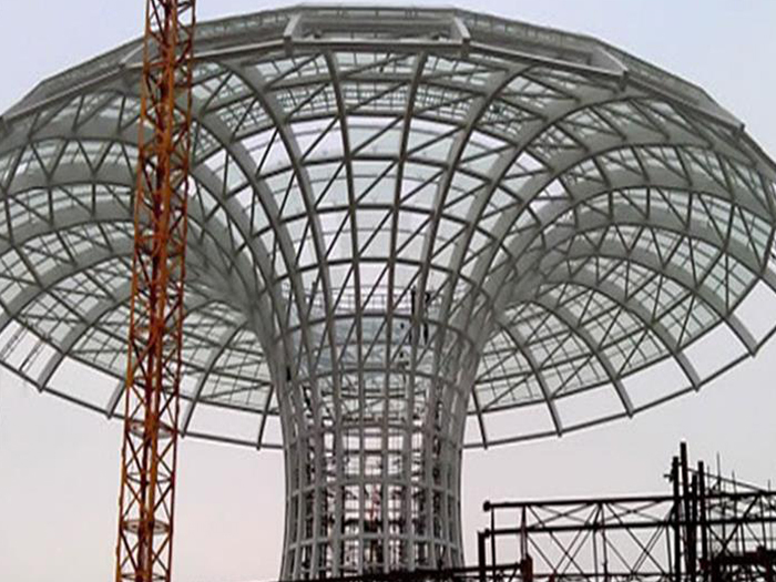二、球形网架结构因其结构新颖,受力合理,自重轻、用钢量低等优点。如大型体育场馆球形中山螺栓球网架、公共场馆球形网架、电厂中山螺栓球网架、水泥工业球形网架、仓储物流球形网架、中山干煤棚工业球形网架、中山收费站中山加油站球形网架、展览中心、影剧院、商场、航站楼、候车厅、工厂中山车间、仓库、电视塔等球形螺栓球节点网架。国内球形网架结构主要分为:中山焊接球节点网架及螺栓球节点网架两种。螺栓球节点网架其构件工厂内加工量较大,现场安装便捷,适用于现场工期紧,中山施工条件、用电量受制约,网架形状复杂、中山杆件定位困难的异形结构。螺栓球节点球形网架系统基本由中山杆件、螺栓球、支撑支座等组成。按照节点形式可分为交叉中山桁架体系、四角锥体系、三角锥体系等。支撑方式多为固定支座支撑。对于大面积、大跨度及有特殊受力或伸缩要求的网架结构可采用橡胶支座、滑移支座、球铰支座等支撑形式,以满足结构自身的受力稳定、均衡,便于内力释放等设计要求。